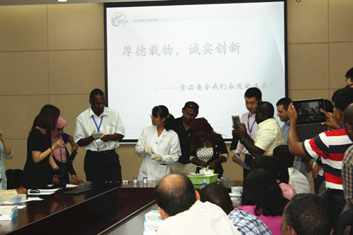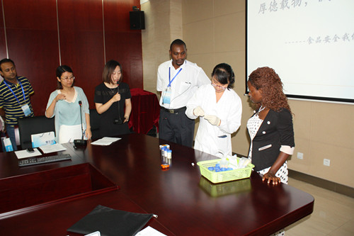技術(shù)人員邀請(qǐng)?jiān)L問團(tuán)友人一起動(dòng)手實(shí)際操作,親自體驗(yàn)快檢產(chǎn)品操作便捷、測(cè)定時(shí)間短、檢測(cè)結(jié)果易于分辨的優(yōu)勢(shì)。