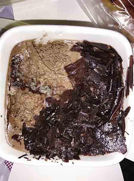 記者從他拍攝的圖片上看到,蛋糕面上的巧克力挑開后,奶油融化的地方的確匯聚著一些綠色斑點。