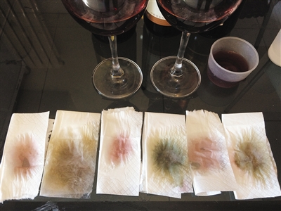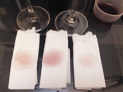 實驗分析:有傳言稱:“紅酒滴在餐巾紙上后,均勻擴散就是真酒。那是因為假紅酒色素顆粒大,會沉淀在巾紙中間,往外擴散的只是水跡。”