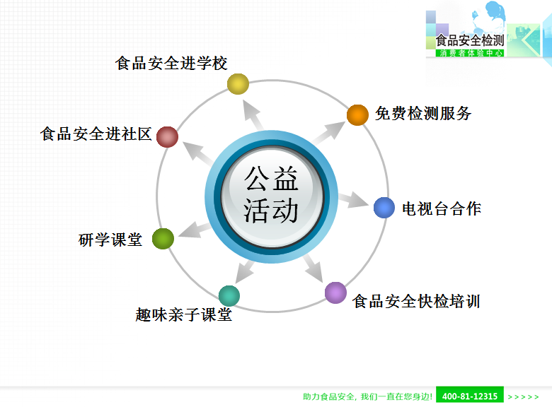 食品安全檢測消費者體驗中心的食安公益活動包括:食品安全快速檢測培訓、食安趣味親子互動課堂、研學課堂、食品安全進社區、食品安全進學校等活動