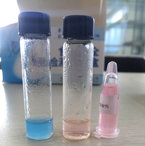 用0.2 mL塑料滴管取油樣,滴6滴于玻璃比色管中,加入1 mL試劑2,搖動10秒,靜置10分鐘,觀察顏色和渾濁情況。