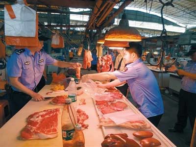 執法人員檢查肉檔的豬肉