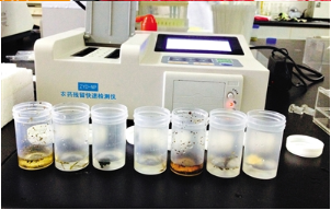 實(shí)驗(yàn)過(guò)程:實(shí)驗(yàn)人員分別稱取2克茶葉樣品,加蒸餾水泡開茶葉。然后加農(nóng)殘緩沖溶液、顯色劑、酶試劑等,搖勻靜置10分鐘后放進(jìn)檢測(cè)儀。儀器屏幕上便顯示出農(nóng)殘抑制率數(shù)據(jù)。