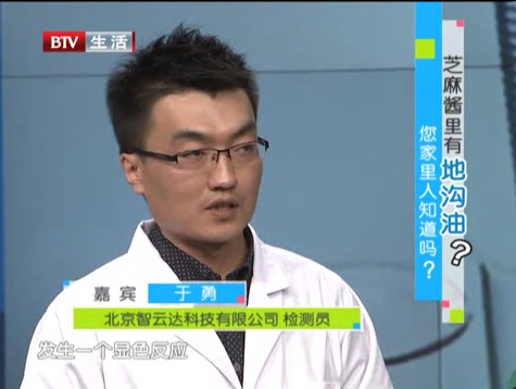 為了證實購買的造假芝麻醬上面含有的一層浮油是否為地溝油,《生活面對面》欄目特邀北京智云達(dá)科技有限公司