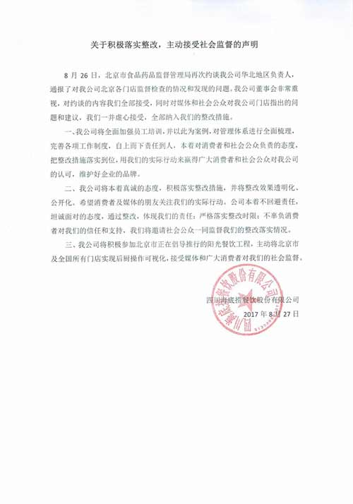 中新經緯客戶端8月27日電 27日下午,海底撈官網發布《關于積極落實整改,主動接受社會監督的聲明》,表示對于北京食藥監的約談內容全部接受,所有門店將實現后廚操作可視化。