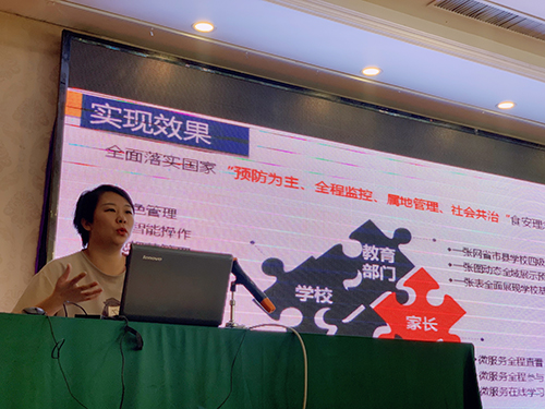 北京智云達(dá)資深產(chǎn)品經(jīng)理錢瑞,為各位參訓(xùn)學(xué)員分享了智云達(dá)在校園餐飲食品安全保障中的智能化解決方案,得到了省教育廳領(lǐng)導(dǎo)的認(rèn)可。智云達(dá)作為國內(nèi)領(lǐng)先的食品安全快檢產(chǎn)品、檢測(cè)服務(wù)以及信息化構(gòu)建的供應(yīng)商及服務(wù)商,為校園餐飲食品營養(yǎng)與安全提供保障,打造了集“食品溯源-明廚亮灶-快速檢測(cè)-校園餐飲營養(yǎng)與安全監(jiān)管-第三方檢測(cè)服務(wù)-食品安全保險(xiǎn)”于一體的智能化系統(tǒng),可實(shí)現(xiàn)可視感知、節(jié)點(diǎn)預(yù)警、過程監(jiān)督、事后追溯的綜合保障。