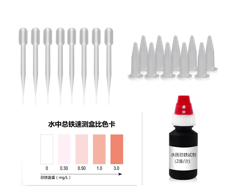 2. 若水樣中總鐵讀數超出比色卡范圍,可用純凈水或蒸餾水將水樣稀釋10倍(如取1mL水樣用純凈水稀釋至10mL,混勻,從中取1mL進行檢測)后重新測定,讀數乘以稀釋倍數(10)得到結果。