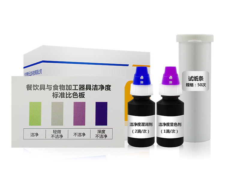 產品用途:餐飲具或食物加工器具上遺留或污染的蛋白質或糖類物質,可與特定試劑反應出現不同顏色,由此可通過與對照色卡比對判斷被檢物體表面潔凈的程度。