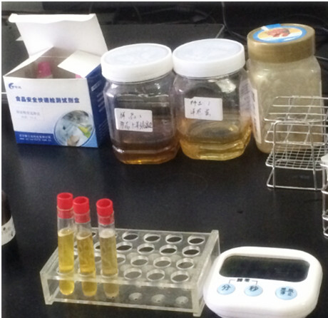 實驗結果,檢測管的顏色為黃色,表明不含淀粉糊精。(常蜂蜜檢測管的顏色為黃色或淡黃色。如果試管溶液變為棕色或紫色或棕紫色,可確定樣品中含有糊精,如果測試液變為灰色或灰藍色,或出現灰色或灰藍色沉淀,可確定樣品中含有淀粉。其顏色隨糊精或淀粉含量的加大而加深或沉淀增多。)