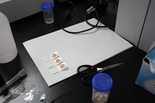 2、取農(nóng)藥殘留檢測卡,將西紅柿樣品提取液的液滴滴在白色藥片上,放置 10min 進(jìn)行預(yù)反應(yīng),預(yù)反應(yīng)后的藥片表面必須保持濕潤。