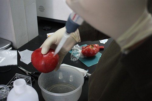 1、滴8ml農(nóng)殘緩沖液在西紅柿表面于干凈容器中。