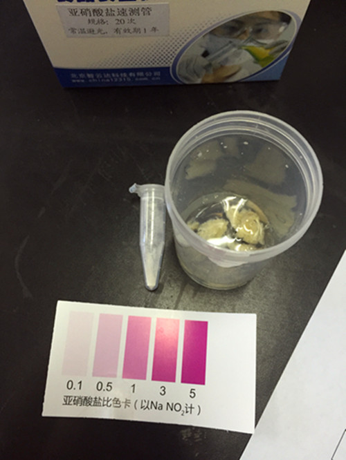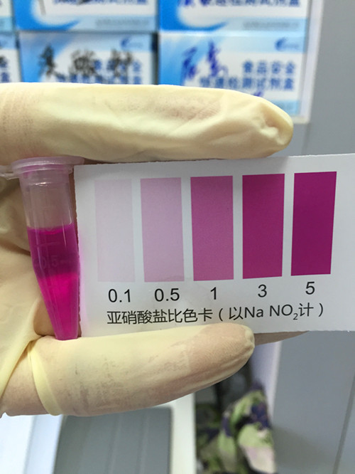 通過顏色比對,我們可以清楚看到顏色由無色變為紫色,參照對比卡,可知此樣本中的亞硝酸鹽含量為30~50mg/kg,屬于陽性樣本。