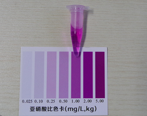 加入2滴試劑2搖勻靜置10分鐘后與標準比色卡對比,該比色卡上的數值乘上10即為樣品中亞硝酸鹽的含量mg/kg(以NaNO2計)。