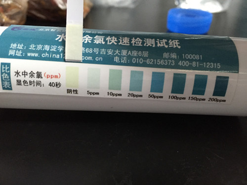 擦掉試紙邊緣多余液體,試紙塊朝上水平放置,40秒時(shí)與色卡比較,讀取結(jié)果。結(jié)果顯示余氯符合國家標(biāo)準(zhǔn)。