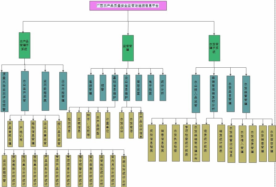 農(nóng)產(chǎn)品質(zhì)量安全監(jiān)管與追溯信息平臺由“農(nóng)資管理子系統(tǒng)、農(nóng)產(chǎn)品管理子系統(tǒng)、農(nóng)產(chǎn)品安全追溯系統(tǒng)、農(nóng)產(chǎn)品質(zhì)量內(nèi)控管理系統(tǒng)”等組成,在圖形界面的軟件環(huán)境下,實現(xiàn)農(nóng)產(chǎn)品質(zhì)量安全信息采集、審核處理、控制執(zhí)行、科學決策的“集成化、可視化、網(wǎng)絡(luò)化和桌面化”。